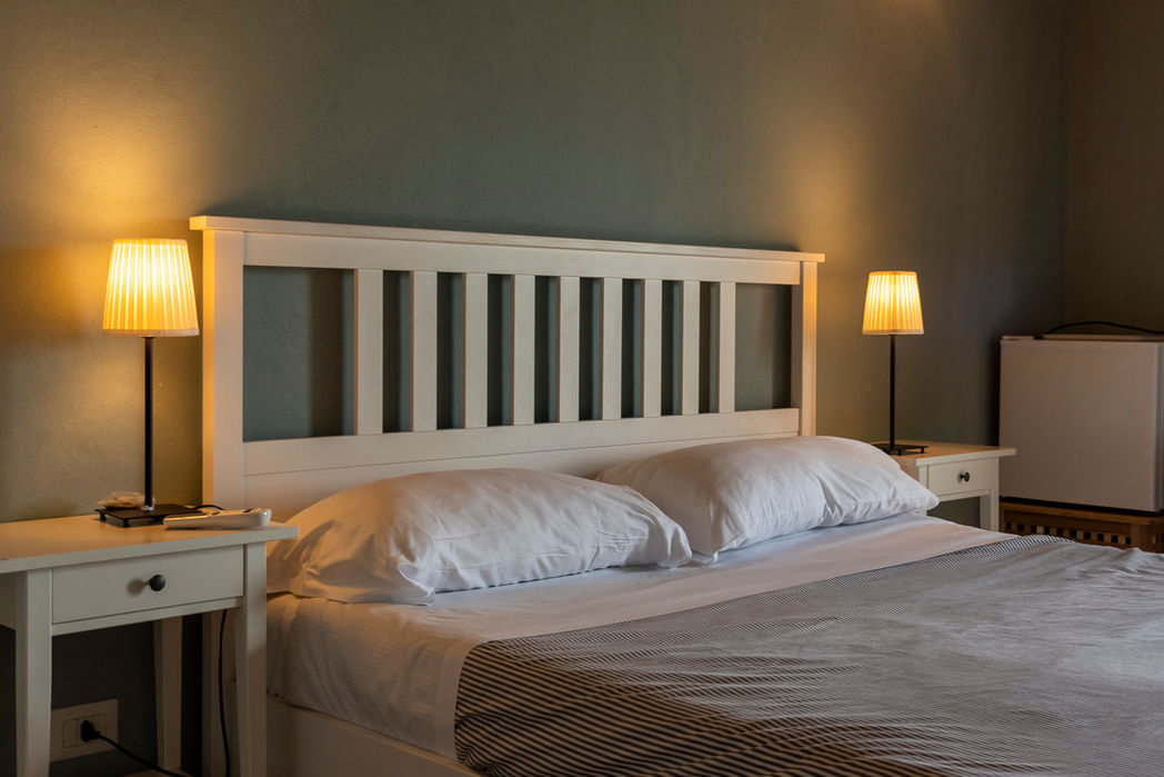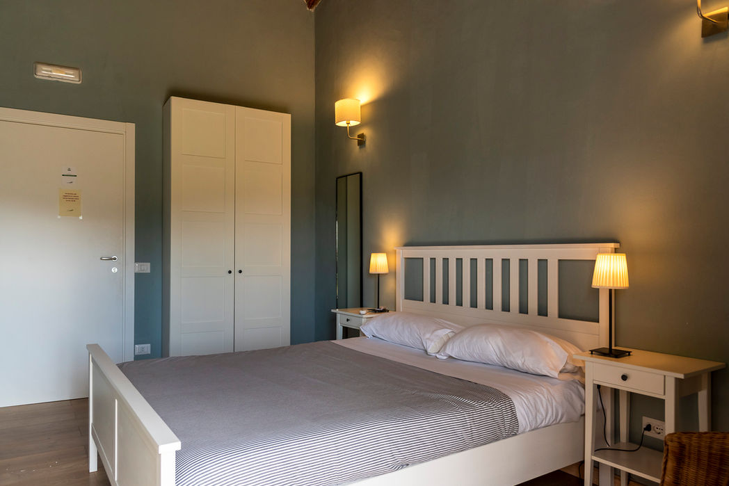 Un ambiente intimo e luminoso, caratterizzato da arredi semplici in stile country e tonalità rilassanti che richiamano i colori della natura circostante. Il letto matrimoniale in legno bianco, il parquet caldo e i dettagli in vimini conferiscono un’atmosfera calda e familiare.